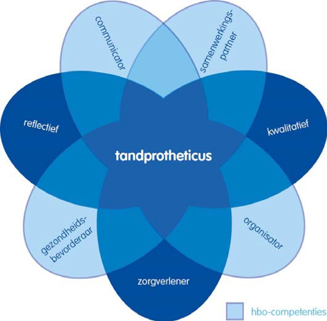 Iedere tandprotheticus die de opleiding met goed gevolg heeft doorlopen voldoet tenminste aan de genoemde competentiegebieden uit het Beroepsprofiel Tandprotheticus. In de onderstaande figuur zijn deze competentiegebieden weergegeven.